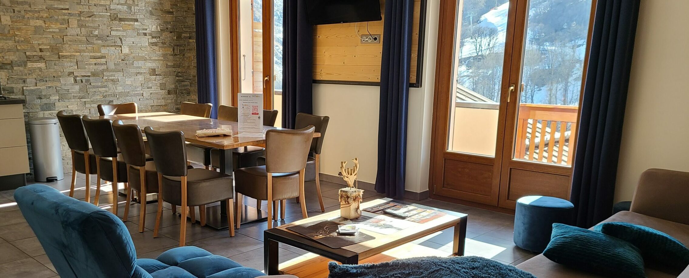Espace de vie spacieux et lumineux avec salon, coin repas et cuisine ouverte, idéal pour partager des moments chaleureux en famille ou entre amis après une journée sur les pistes.